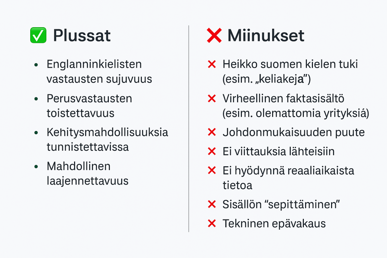 Tulimme siihen tulokseen, että HuggingChatin käytettävyyttä ja luotettavuutta voisi lähteä kehittämään alkuun hyvin yksinkertaisilla ja selkeillä kehotteilla sekä hyödyntämällä ajantasaisia ja luotettavia tietolähteitä. Sellaisia voisi olla esimerkiksi matkailualan viralliset sivustot, Visit Finland -organisaatio, yritysten omat verkkosivustot ja liikennepalveluiden sivustot.
