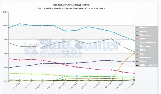 Niinpä niin. Katsellaanpa käyriä. Nokia laskusuunassa, kuten myös Apple. Samsung porskuttaa eteenpäin. Huomaatko mikä puuttuu? Tai mikä on tuo “Unknown”.