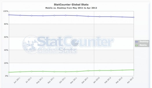 Havaittavissa toki on Internetin mobiilikäytön kasvua ja voidaankin todeta, että 10% käytöstä on mobiilia. Tällä kulmakertoimella mobiilikäyttö kasvaa työpöytäkäyttöä suuremmaksi noin 40 vuoden päästä… voidaan siis todeta, että tällä hetkellä eletään täysin “huumassa” 🙂 .
