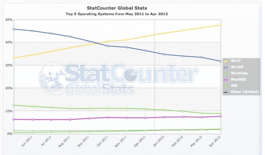 Windows XP:n suunta on todella masentava. Mutta Windows 7 paikkaa tilanteen. Applen OSX ja IOS toki ovat nousussa, ei kuitenkaan ehkä sellaisessa, mihin puheista olisi uskonut.