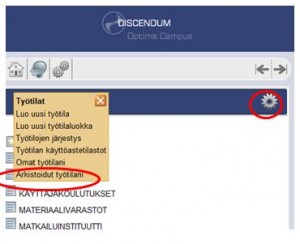 Työtila siirtyy henkilökohtaiseen arkistoosi. Työtila ei näy tämän jälkeen sen jäsenille.  Löydät arkistoidut työtilasi Optimasta valitsemalla kohdasta Työtilat  ratas -kuvakkeen alta Arkistoidut työtilani. Voit palauttaa työtilan jälleen käyttöön vaihtamalla sen yleisasetuksista työtilan tyypiksi alasvetovalikolla ”Vakiotyötila”.