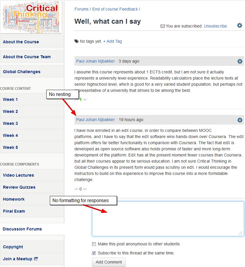 An example from a Coursera forum (with only my own messages and leaving out the Coursera and Edinburgh University logos, so as to avoid trademark or copyright issues). It demonstrates the lack of nesting. Nothing suggests that the second message is in fact a reply to the first. You can also see that there are no formatting options for replies and that all students can choose to remain anonymous, something that should not be encouraged in my opinion. Participants should stand for their contributions (with the possible exception of users from those countries where such frankness may lead to prosecution, but they can always opt to use a pseudonym).