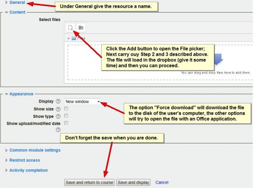 Instead of adding a file from your GAFE drive as a link to a piece to text, you can also add a GAFE drive file to the course page. To do that you turn editing on on the course page and click the Add an activity or resource link at the bottom of a course section. In the resulting pop up window, scroll down and under RESOURCES, select File. The following settings page will open: