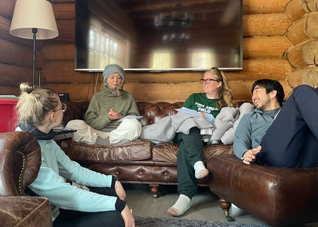 In the afternoon, the cabin becomes a pirate ship, thanks to Camilla Brudin Borg’s utopia assignment. Sitting in front of the fireplace, we move from ship to ship. There is no more land in sight. The water surface is high due to climate warming. The year is 2070, and we are on a mission. We are a group of pirates confiscating “bad science” and “bad art”. We draw a map. The treasure is marked with a red X. Pink Beard is the captain of the crew. Right Hand is their first hook. Blue Scout is the sneaky one; they go first and scout the environment, find out what’s going on, and assess the situation. Brown Shadow is the best swimmer and can breathe underwater, which comes in handy when the crew needs to access the underwater volt. We get to decide what it is that we find from the red X, too. We find a treasure chest that can translate “bad science” into good ideas, happiness, and kindness. Other groups find cool things, too, and we are excited to learn from their stories. It feels like we are kids, just making things up after another. We get to decide how the stories go. Even though the start setting is challenging with the high sea level, we get to choose a way forward. It does not have to be realistic. There are no limits to consider. We can focus on imagining and acting upon that imagination.