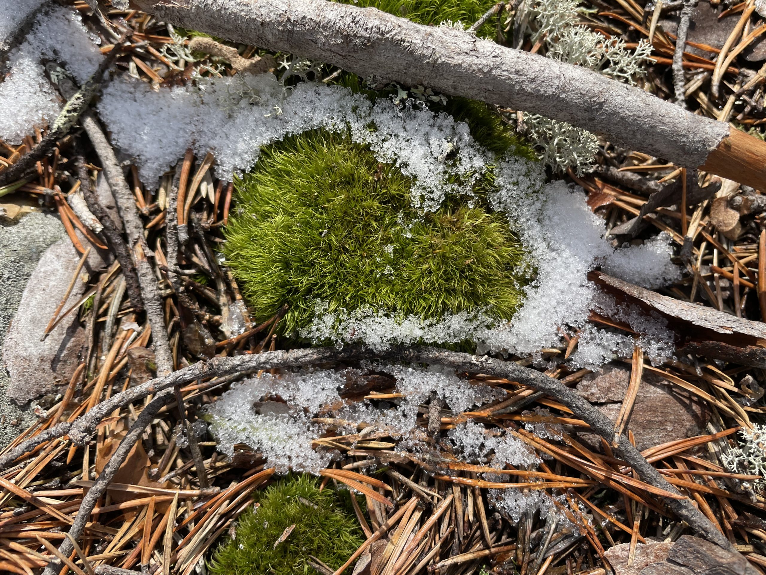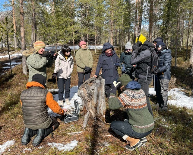 These four days at the end of April 2025 are different. We are at the core of Pyhä-Luosto National Park, formed by the southernmost line of fells in Finland. This area serves a variety of purposes, including nature conservation, local community use, hiking, and tourism. We feel the wind in our hair. We hear the forests whisper their secrets. Our research station (the Keropirtti cabin) is situated right on the border of the national park area. We are lucky to come here for work every now and then. We even have a small pond behind the window, freckled with rays of sun and fallen pieces of tree bark.