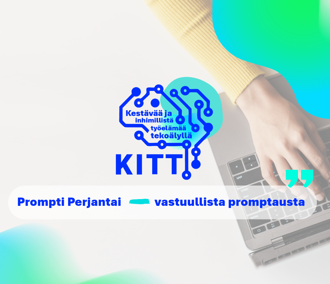 meidän Tietopaketit Esitietopaketti no 1. Tutustu tästä KITT-hankkeen pääpointteihin. PDF-TIEDOSTO Prompti Perjantai Haluamme tehdä generatiivisen tekoälyn työvälineistä ymmärrettävää ja saavutettavaa vuorovaikutuksen kautta – siksi käynnistimme Prompti Perjantai -somejulkaisusarjan. Prompti perjantai linked in
