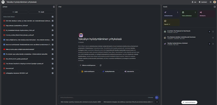 NotebookLM-sovelluksessa käyttäjä kerääkin itse luotettavat lähteet ja aineistot ja käsittelee niitä tekoälyn avulla. Tämä soveltuu asioiden oppimiseen ja asiantuntijatyön tekemiseen. Edelleen kannattaa kuitenkin tarkistaa tekoälyn aineistosta tekemät tulkinnat.