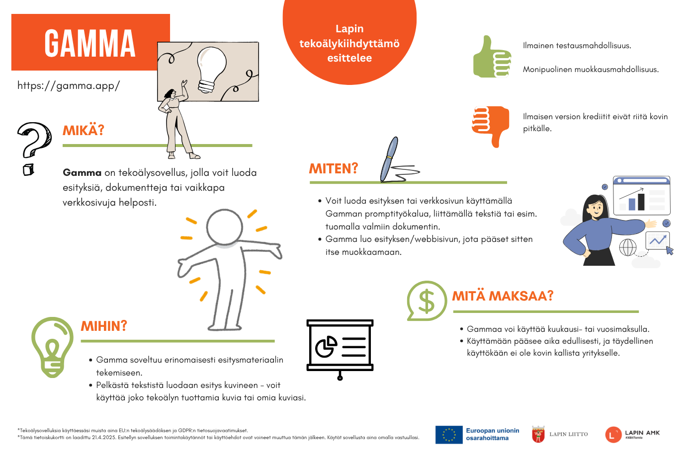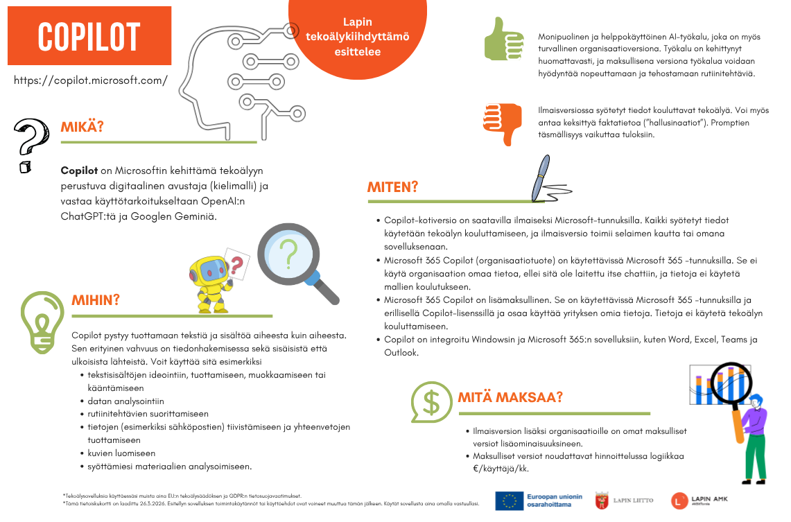 *Ammattikorkeakoulun hankkeessa kokeillut ja arvioidut tekoälytyökalut on esitelty yrityksille ja organisaatioille informatiivisessa tarkoituksessa. Ammattikorkeakoulu, sen opettajat ja hanketyöntekijät eivät vastaa tekoälytyökalujen käytöstä aiheutuvista tietoturva-, tietosuoja- tai muista vahingoista, jotka syntyvät yritysten tai organisaatioiden omassa toiminnassa.