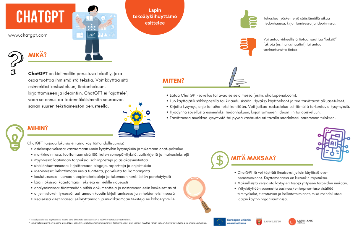 ChatGPT on kielimalliin perustuva tekoäly, joka osaa tuottaa ihmismäistä tekstiä. Voit käyttää sitä esimerkiksi keskusteluun, tiedonhakuun, kirjoittamiseen ja ideointiin.