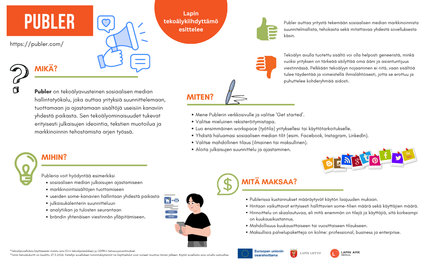 Publer on tekoälyavusteinen sosiaalisen median hallintatyökalu, joka auttaa yrityksiä suunnittelemaan, tuottamaan ja ajastamaan sisältöjä useisiin kanaviin yhdestä paikasta.