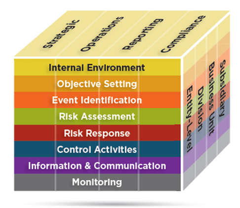 Committee of Sponsoring Organizations (COSO) julkaisi vuonna 2004 Enterprise Risk Management – Integrated Framework (ERM) -viitekehyksen. Viitekehyksessä riskienhallintaa tarkastellaan koko organisaation toteuttamana prosessina strategian laatimisesta riskien tunnistamiseen ja riskienhallintaan organisaation tavoitteiden toteutumiseksi. Viitekehys koostuu kahdeksasta eri riskienhallinnan toiminnosta, neljästä eri riskiluokasta neljässä eri organisaatiotasossa. (Frigo & Anderson 2011, III, 9; Jemaa 2022, 1.) Viitekehys on kuvattu visuaalisesti helposti hahmotettavana kuutiona.