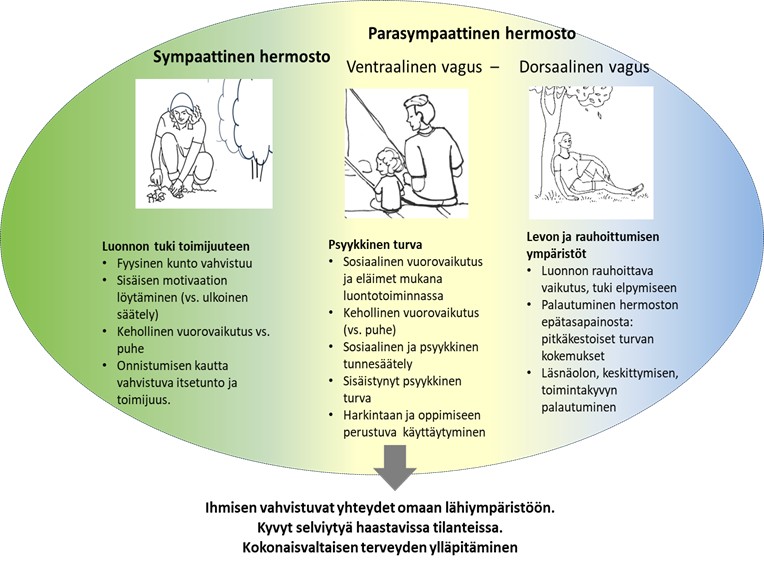 Polyvagaaliteorian mukaan (Kuva 2) sympaattisen hermoston aktivoituminen nostaa ihmisen vireystilaa ja tukee toiminnallista ongelmanratkaisua. Luonto tarjoaa monia mahdollisuuksia toimintaan ja tekemiseen matalalla kynnyksellä, minkä kautta ihminen voi vahvistua oman elämänsä toimijana, ja samalla löytää tapoja vahvistaa myös fyysistä kuntoa. Parasympaattisen hermoston dorsaalinen haara puolestaan laskee vireystilaa, jolloin ihminen pystyy elpymään levon ja rauhoittumiseen kautta ja ottaa pientä etäisyyttä haastavaan tilanteeseen.
