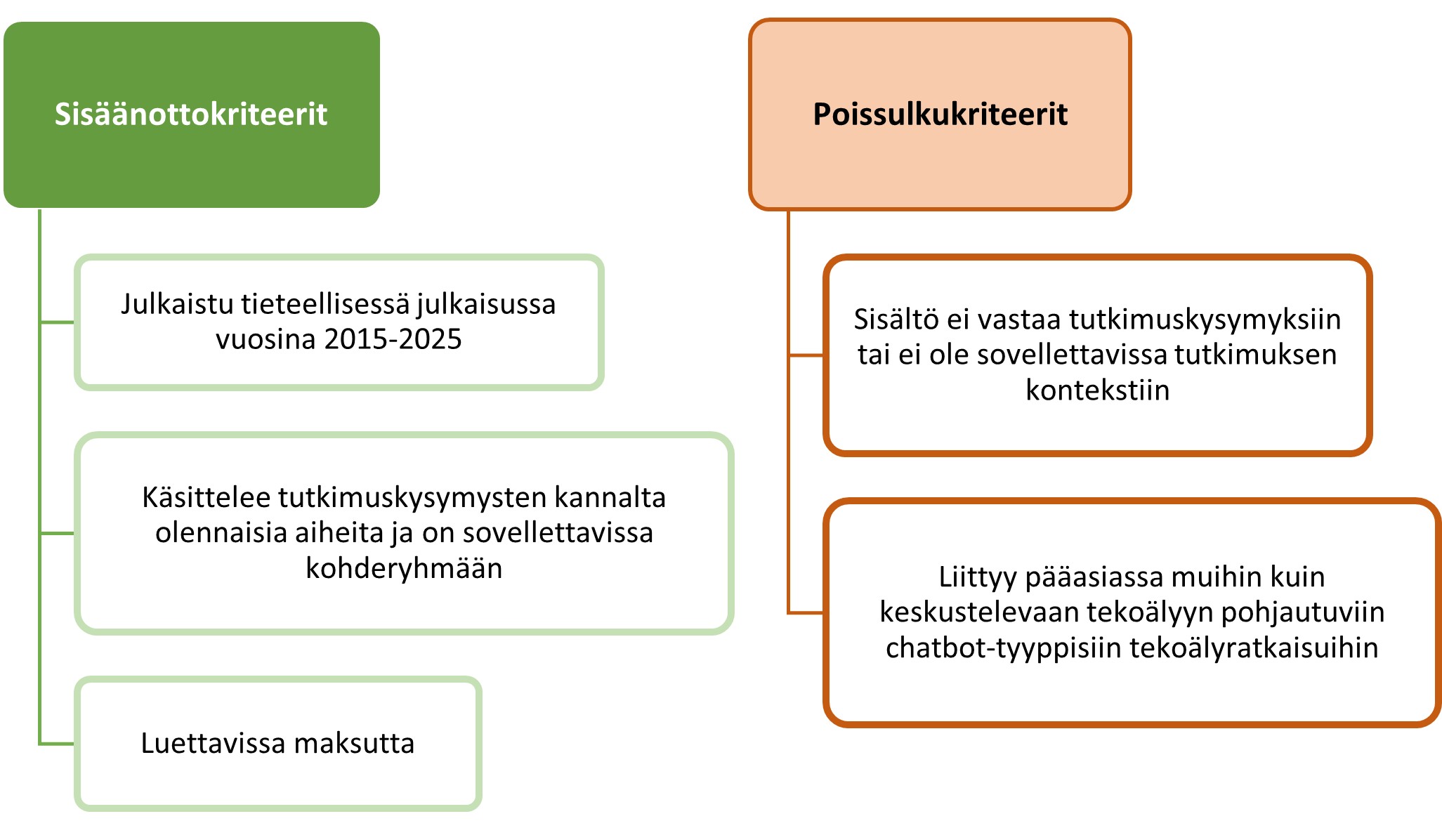 Aineistonhaku suoritettiin Sage Journalsin tietokannassa joulukuussa 2025. Lisäksi aineistoon valittiin aineistonhaun ulkopuolelta kotimaisessa DIGISOS-hankkeessa (2023–2025) tuotettu tuore tutkimusjulkaisu, joka tuli aineistonhakuprosessin aikana vastaan muussa yhteydessä. Aineistonhakua tehtiin erilaisilla tekoälyyn, AI-chatbotteihin, eettisyyteen ja haavoittuvuuteen liittyvillä hakusanayhdistelmillä englanniksi. Aineistonhaun aikana tulosten sopivuutta aineistoksi arvioitiin ja karsittiin ensin otsikon perusteella, sitten artikkelin tiivistelmän, johdannon ja silmäilyn perusteella. Kuviossa 1 on kuvattu aineistohaussa käytetyt aineiston sisäänotto- ja poissulkukriteerit.