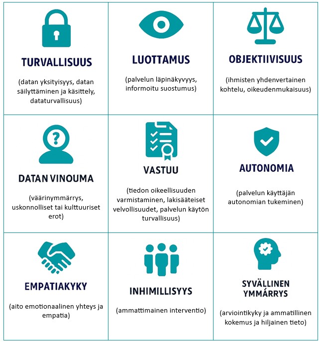 Eettiset näkökulmat eivät kuitenkaan ole toisiaan poissulkevia. Päinvastoin näkökulmien välillä on osin suuriakin liitännäisyyksiä tai riippuvuuksia. Tekoälypohjaisen chatbotin vastuullisessa kehittämisessä näkökumien huomioiminen korostuu. Riskianalyysissä tarkastelun rinnalle on nostettava haavoittuvassa elämäntilanteessa olevan kohderyhmän erityistarpeet ja -vaatimukset palvelulle.