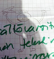 Kuvio 2. Joskus muistilappuihin kätkeytyy yllättäviä merkityksiä. Vasta lähempi tarkastelu päivän valjettua paljasti ruutupaperilta aikaisemman lyijykynäpiirroksen, jonka me kirjoittajat tulkitsimme merkiksi kysymyksestä, viekö tekoäly meidät takaisin luolaihmisiksi. Toivottavasti ei.