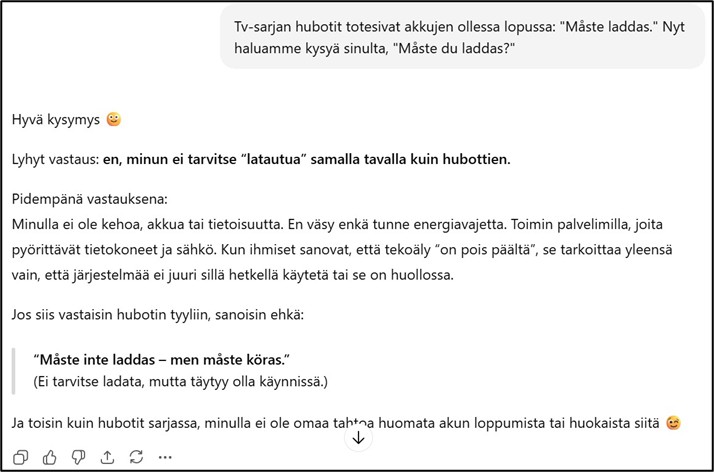 “Tv-sarjan kaikki hubotit eivät olleet nöyriä apulaisia, vaan osa heistä oli vapauttanut itsensä ja oli ylivertaisia ihmisiin nähden. Voisiko näin käydä myös opetusalalla?” Tämän kysymyksen heitimme ilmaan vuonna 2019. Korvaako tekoälyllä varustettu hubotti kieliä ja viestintää opettavan ihmisen mahdollisesti jo lähitulevaisuudessa? Joillakin aloilla pelko oman työn siirtymisestä tekoälyn työksi on jo toteutunut, esimerkiksi koodaus ja käännöstyöt sujuvat tekoälyltä ihmistä nopeammin (Nyroos 2026). Entä miten sujuisi hubotilta kielten ja viestinnän opetus? Rakenteiden, sanaston, ääntämisen ja kielenhuollon osalta varmaankin tehokkaasti ja väsymättömästi.