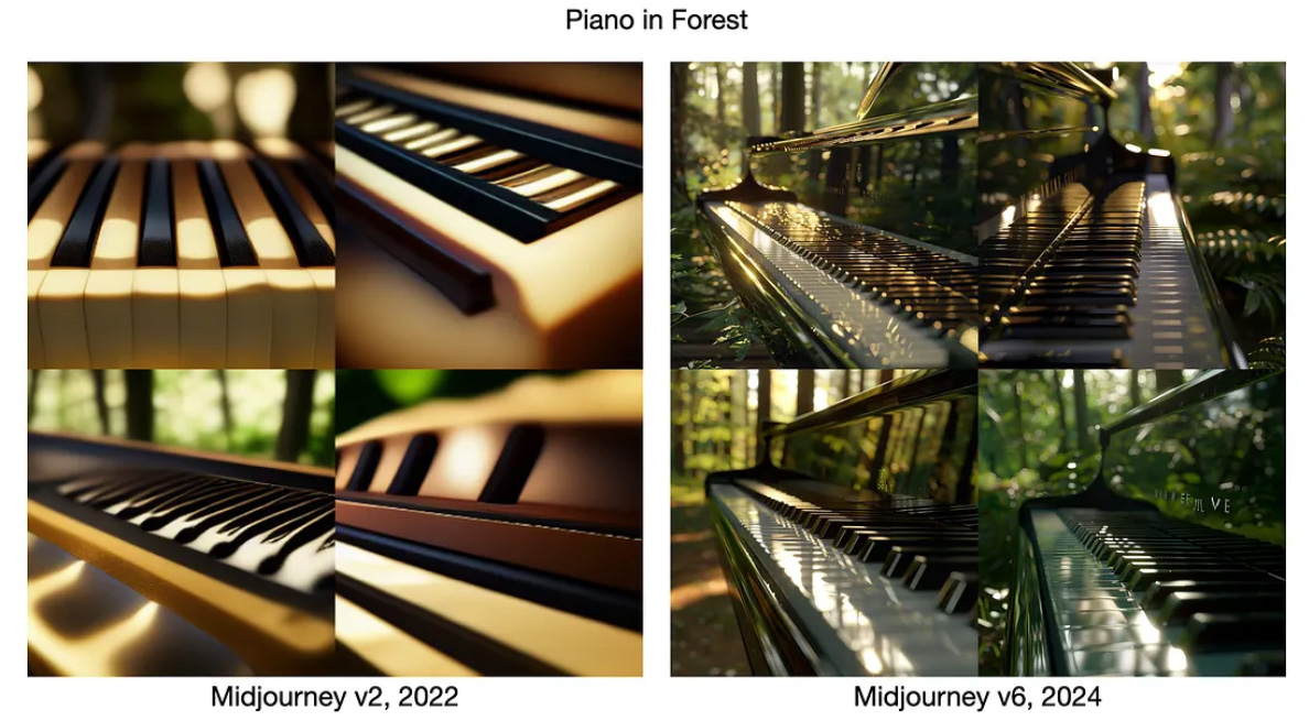 Kuva 1. June-Hao Houn havainnot Midjourneyn kehityksestä eri promptauksilla (Hou 2024).
