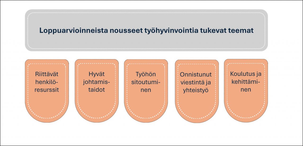 Sanallisista arvioinneista (kuvio 1) voidaan tunnistaa samoja työhyvinvointiin liittyviä teemoja kuin kansainvälisissä tutkimushavainnoissakin. Kun arvioinnit luokiteltiin, vastauksista nousi viisi sekä projektin onnistumista että työhyvinvointia tukevaa teemaa: riittävät henkilöresurssit, hyvät johtamistaidot, työhön sitoutuminen, onnistunut viestintä ja yhteistyö sekä koulutus ja kehittäminen. Näiden pohjalta voidaan suunnitella työhyvinvointiin vaikuttavia kehittämistoimia seuraaviin projekteihin. Etenkin hyviin johtamistaitoihin sekä onnistuneeseen viestintään ja yhteistyöhön liittyviä mainintoja oli paljon. Ajoissa tiedottaminen, asiakkaan aktiivinen osallistuminen projektiin, projektipäällikön asiantuntemus ja projektin määrätietoinen eteneminen koettiin loppuarvioinneissa tärkeiksi onnistumisiksi.