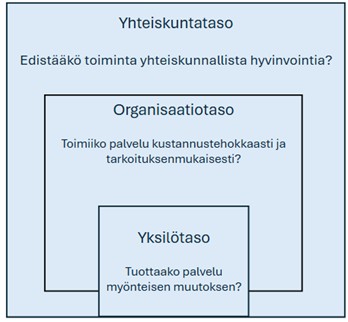 Sosiaalihuollon vaikuttavuutta voidaankin tarkastella esimerkiksi yhteiskunnallisella, palvelujärjestelmä- tai organisaatiotasolla yksilötason lisäksi (esim. Mäki-Opas & Laatikainen 2021, 29; Pekkola, Leponiemi & Heikkilä 2025, 9). Näitä tasoja havainnollistetaan kuviossa 1. Yksilötasolla tarkastelun kohteena on palvelun asiakasvaikutus. Organisaatiotasolla keskiössä on palveluiden toimivuus ja kustannukset. Yhteiskuntatasolla olennaista on puolestaan laajemmat yhteiskunnalliset vaikutukset, hyvinvointi sekä resurssien kohdentaminen. Vaikuttavuuden tarkastelun tasot ovat dynaamisessa yhteydessä toisiinsa. Esimerkinomaisesti kiteytettynä: yksilöille tarjottavat palvelut sekä niiden vaikutukset ja vaikuttavuus heidän tilanteeseensa ovat yhteydessä siihen, mitä palveluita organisaatiossa tarjotaan ja lopulta siihen, millaisia rakenteita yhteiskunta luo yksilön ja perheiden tilanteiden tukemisen ympärille. Yksittäisten asiakkaiden tilanteisiin aikaansaadut vaikutukset “kasaantuvat” vaikuttavuustiedoksi, joka ohjaa yhteiskuntatasolla palvelujärjestelmään liittyvää päätöksen tekoa.