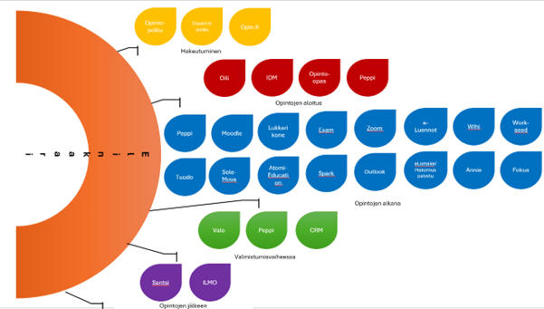 Korkeakoulun digitaalinen palveluympäristö on laajentunut vaiheittain, jopa hieman huomaamatta taustalla. Vuosien aikana käyttöön on tullut uusia järjestelmiä hakemiseen, opiskelun aloittamiseen, oppimiseen ja opettamiseen, viestintään, ohjaukseen, harjoitteluun, valmistumiseen ja alumnivaiheeseen. Samanaikaisesti nämä kytkeytyvät entistä tiiviimmin sekä toisiinsa että kansalliseen koulutuksen digitaaliseen ekosysteemiin. Tarkastelemme tätä kokonaisuutta oppijan ja korkeakoulun näkökulmasta.