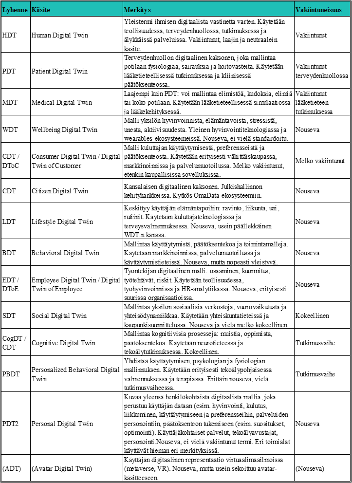 Taulukkoon 1 on koottu Copilotin tuottamat vastaukset digitaalisiin kaksosiin liittyvistä lyhenteistä, käsitteistä, niiden merkityksistä sekä vakiintuneisuuden asteista. Jokainen lyhenne ja termi on tarkistettu etsimällä aiheeseen liittyviä artikkeleita ja muita luotettavia verkkolähteitä. Listauksesta on poistettu yksi vaihtoehto, Individual Digital Twin (IDT), sillä se viittaa yleisesti samaan ilmiöön kuin taulukossa jo mukana oleva Personal Digital Twin (PDT2). Todennäköisesti erilaisia ihmiseen liittyviä digitaalisen kaksosen käsitteitä on olemassa vielä enemmän. Taulukon tarkoituksena on ennen kaikkea havainnollistaa, miten digitaalisten kaksosten käyttö on laajentunut ja laajenemassa erilaisiin ihmiskeskeisiin konteksteihin. Artikkelin näkökulmasta keskeisiä Human Digital Twin ‑käsitteestä johdettuja esimerkkejä ovat erityisesti Consumer Digital Twin (kuluttajan digitaalinen kaksonen), Social Digital Twin (sosiaalisten verkostojen digitaalinen kaksonen) sekä myös Wellbeing Digital Twin (hyvinvoinnin digitaalinen kaksonen).