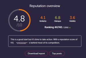 yrityskäyttöön. Tähän sovellukseen olen itse tutustunut jo aiemmissa opinnoissani ja pidän siitä kuinka selkeitä kehittämisehdotuksia sovellus minulle antaa. Sovelluksesta on olemassa kokeiluversio, jonka käyttö on suppeampaa kuin maksullisen version, mutta kokeiluversiokin antaa hyviä eväitä sometekemisen kehittämiseen. Se antaa ns. yleisarvosanan lisäksi arvosanat samankaltaisuudesta, dialogista ja näkyvyydestä. Se myös vertaa (ranking) someprofiileita muihin samankaltaisiin organisaatioihin. Kuvankaappaus kertoo tilanteesta, jossa jotain tarttis vähän tehä!