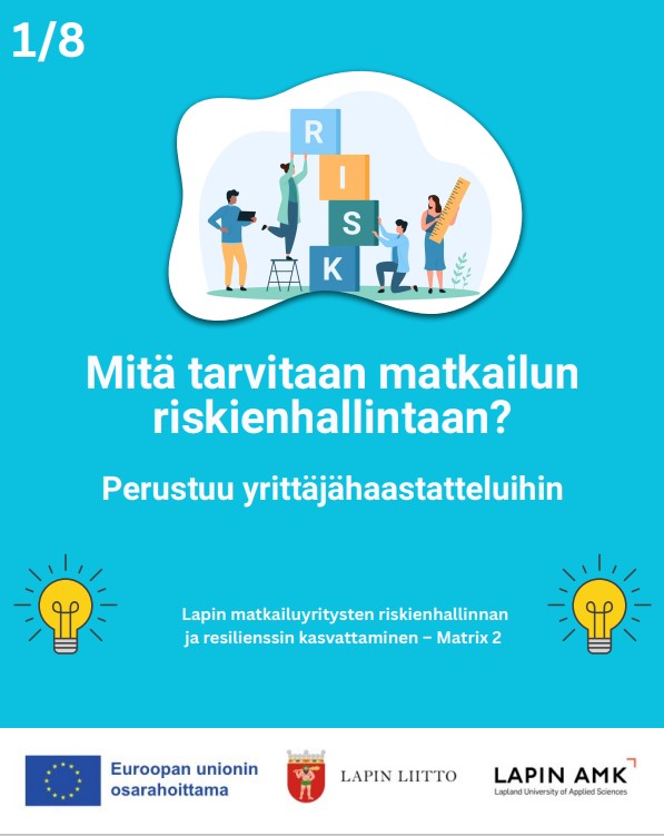 Matrix 2 –hanketiimi työstää parhaillaan riskienhallinnan digityökalua, jossa huomioidaan mm. yllä mainitut Lapin erityispiirteet. Tarkoituksena on tukea matkailuyritysten strategista riskienhallintaa ja ennakointityötä ja vahvistaa resilienssiä matkailualan vauhdikkaassa toimintaympäristössä.
