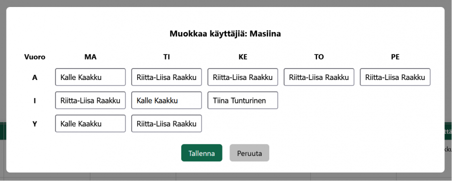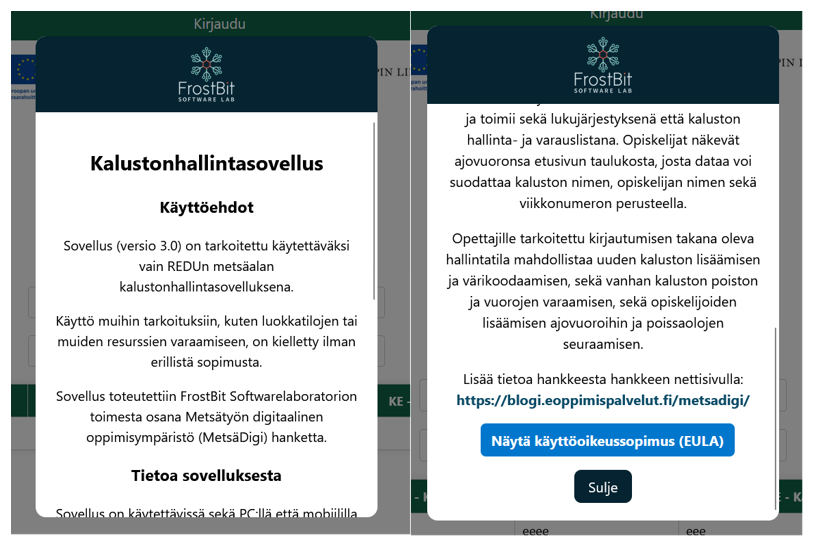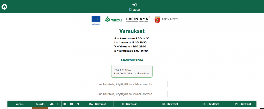 Opettajille tarkoitettu kirjautumisen takana oleva hallintatila mahdollistaa uuden kaluston lisäämisen ja värikoodaamisen, sekä vanhan kaluston poiston ja vuorojen varaamisen.