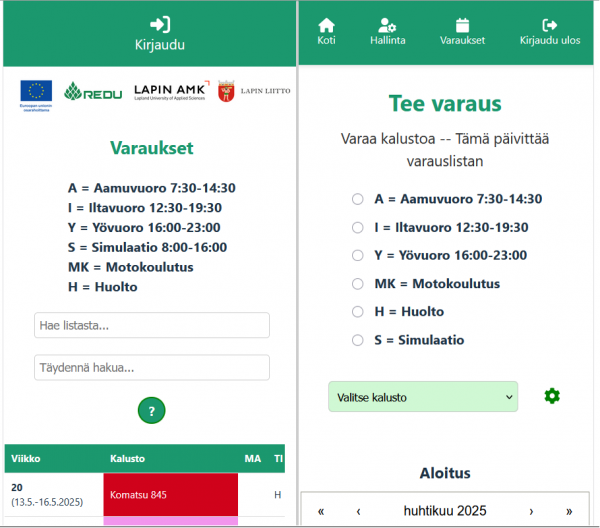 Opettajille tarkoitettu kirjautumisen takana oleva hallintatila mahdollistaa uuden kaluston lisäämisen ja värikoodaamisen, sekä vanhan kaluston poiston ja vuorojen varaamisen.