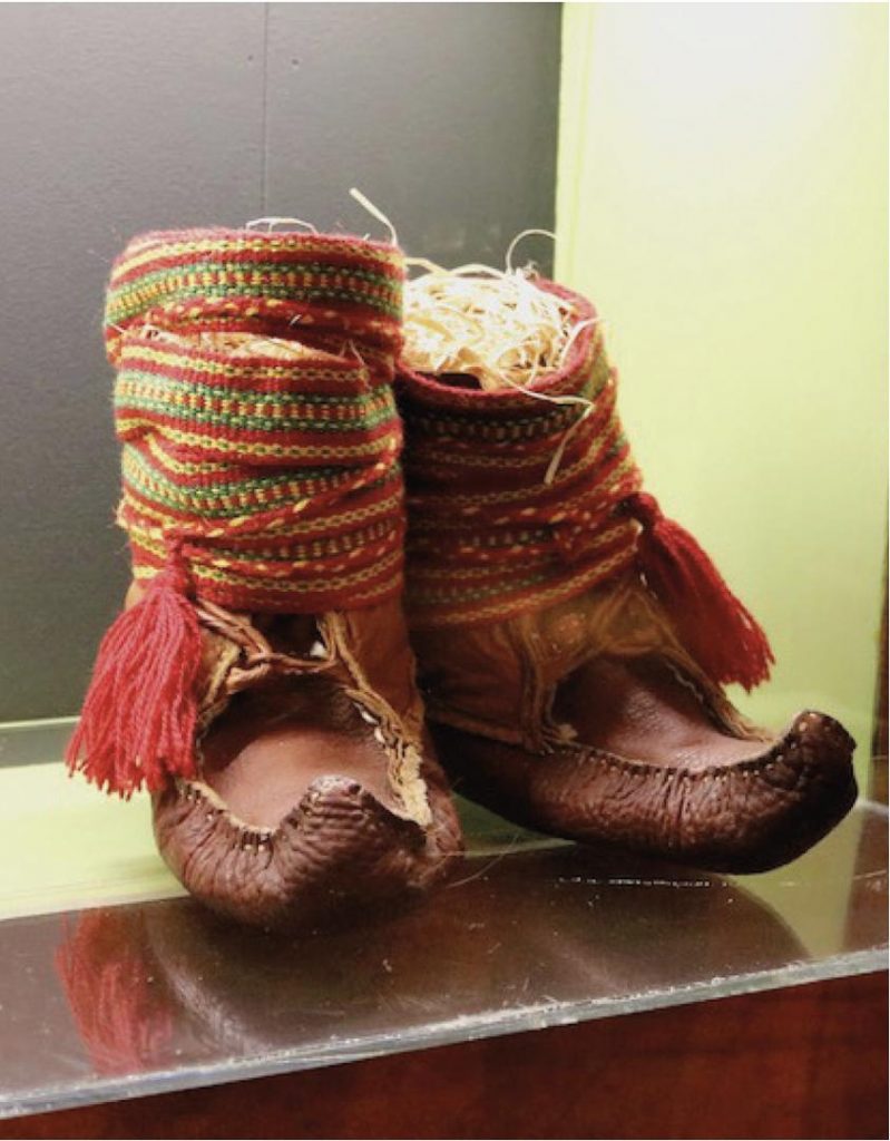 He is a mummified human who lived in the Neolithic about 5200 years ago. He had just been found in a glacier in the Alps when I as a paleontology student got the opportunity to see the remains, but also his clothes and equipment. His shoes consisted of a shell and sole of bear and deer skin, a skeleton of linden bark and dried grass and sedges (Figure 2) that were used as insulation (O’Sullivan et al., 2016), something we also know from traditional Sami shoes, called Skulls (Figure 3).