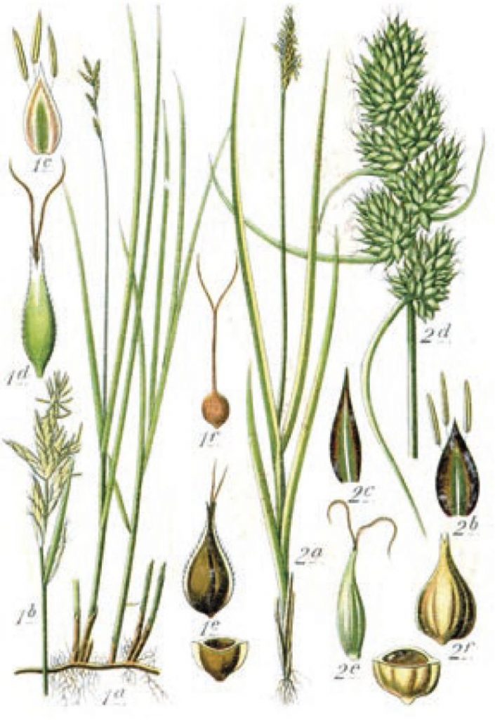 Figure 5. Carex brizoides, the quaking sedge is native to Central and Southern Europe. The stem is triangular and thin and can grow up to 40-100 cm long. Photo: J. G. Sturm, Painter: Jacob Sturm