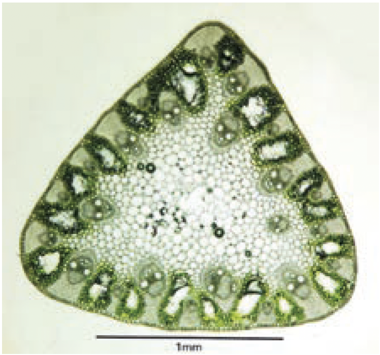 Figure 7: Cross section of a sedge. The air filled rooms in the stem tissue will both contribute to isolation and regulation of moist. Photo: Stefan Lefnaer