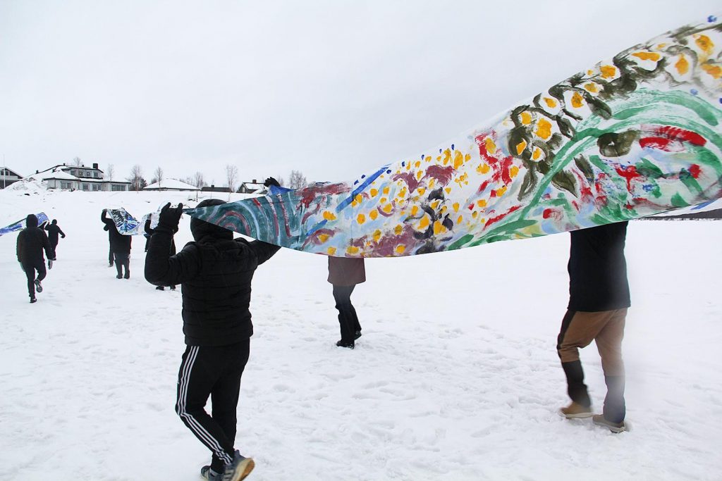 Finally, the artistic work extended from indoor spaces to the outdoors, with long paintings on fabric becoming the centerpiece of a performance on the ice of the Karasjok River. The events offered local residents the opportunity to experience contemporary art methods and participate in creating works and pop-up exhibitions resulting from the events.