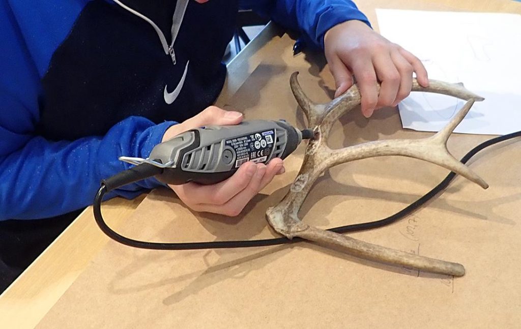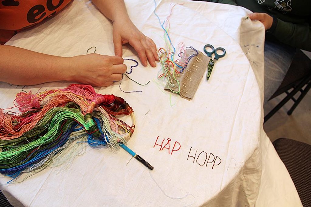 The people of Karasjok suggested that the workshop’s theme be the river, to be approached in accordance with the AAE agenda through contemporary Arctic art, integrating visual arts, design, crafts, and digital work in the spirit of Arctic art. This created a communal and performative activity that began with a visit to the Sámi Contemporary Art Centre’s exhibition and continued with a collective group painting workshop focused on experiences of the river. At the same time, work was done with materials closely linked to Sámi culture, such as colorful yarns and reindeer antler carvings.