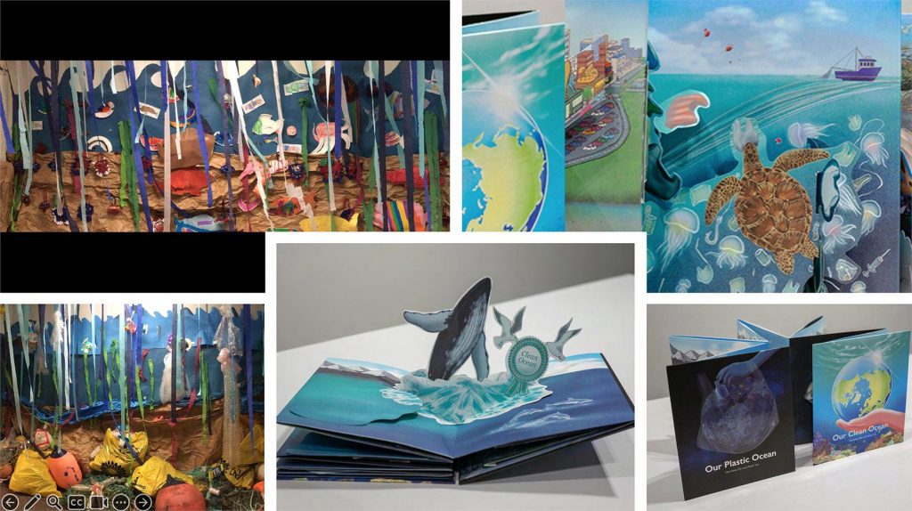 Figure 3. Our Plastic Ocean, Our Clean Ocean: A creatively reversible popup book explaining not only how our ocean plastic pollution crisis came to be, but why we must find solutions as quickly as possible. Photos: Herminia Din, 2019.