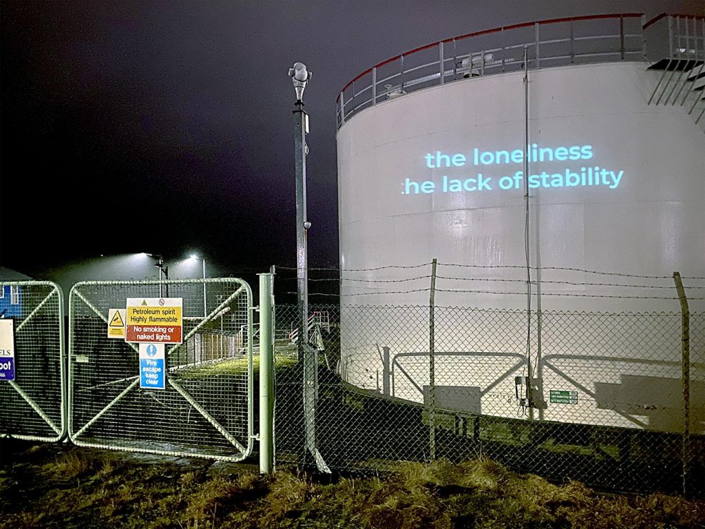 Figure 2. Projectile. The Gas Tanks. Text is excerpt from writing by a member of the #SHETLANDCREW. Lerwick, Shetland. 2021. Photo copyright: #SHETLANDCREW and Home and Belonging.