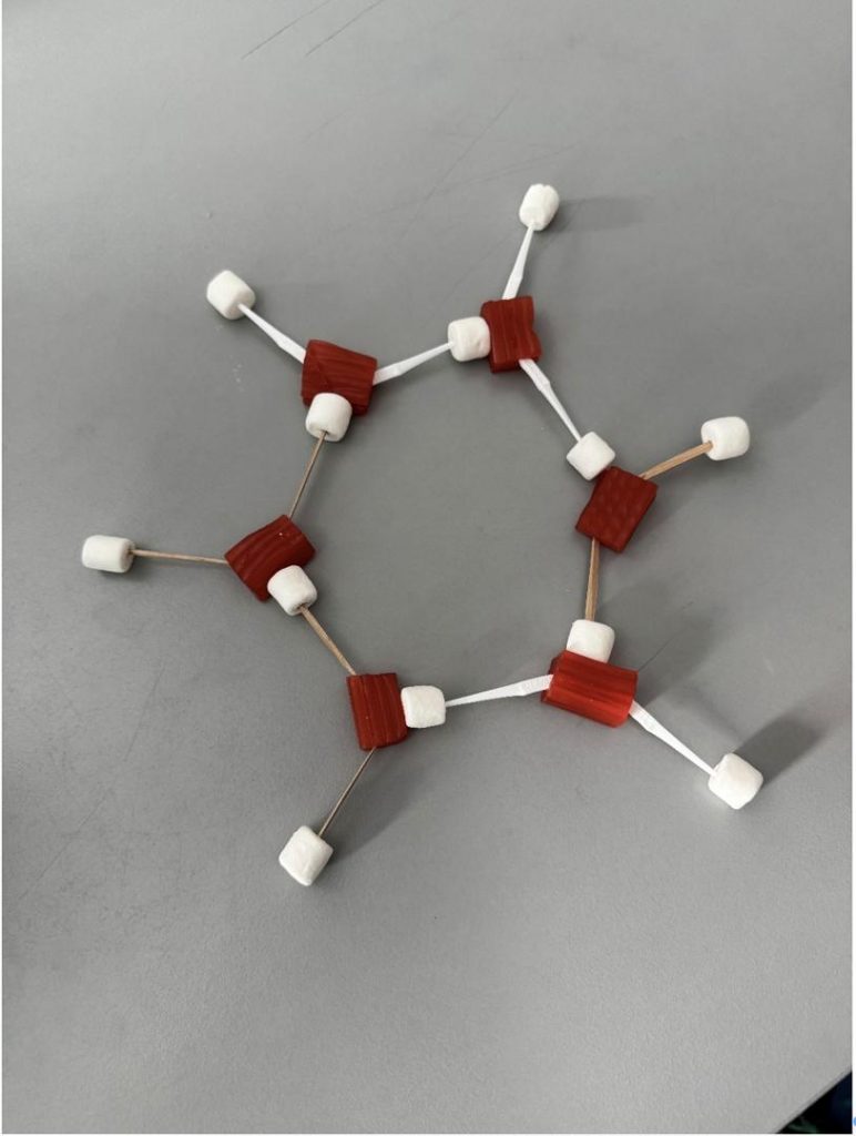 Image 2: Model of a snow crystal made from six water molecules using toothpicks and candy. Photo: Mette Gårdvik, 2025.