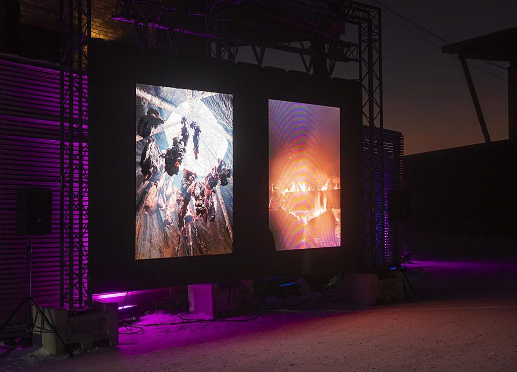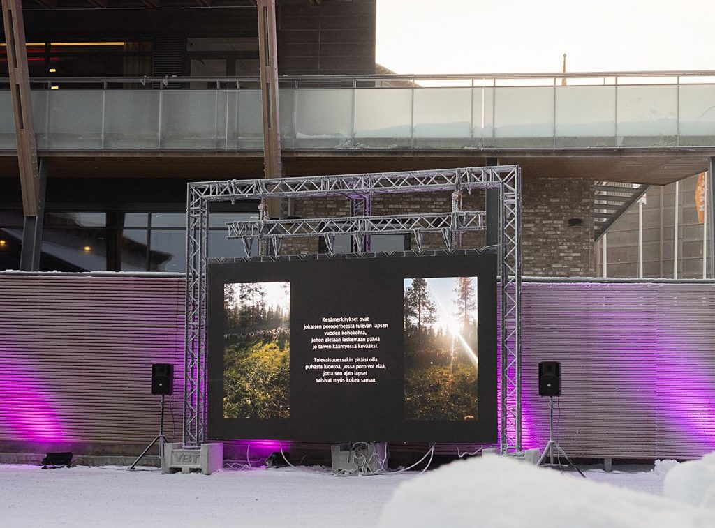 We conducted the artistic process in the au- tumn 2022 in Finnish and Norwegian Lapland and Eastern Finland. The process was facilitated partly live and remotely. After the data collection, we dramatize the video artwork. The video artwork was edited, and sound designed by videographer Inka Holck. We set up the video artwork on a four meter wide LED screen the day before the Aurora Future event started. The artwork was positioned so that all visitors attending the event could see it (Figure 4).