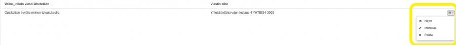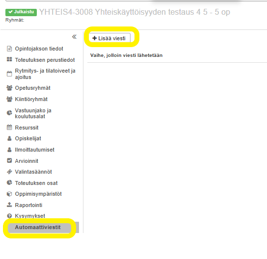 HUOM! Jos toteutuksella on opetusryhmiä, automaattiviestejä ei tällä hetkellä kannata käyttää. Tällä hetkellä automaattiviesti lähtee virheellisesti aina, kun opiskelijoita asetetaan opetusryhmiin.