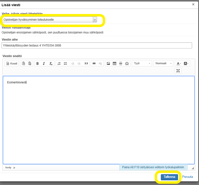 Kirjoita viestikenttään viestin sisältö. Voit muotoilla viestiä ja lisätä viestiin hyperlinkin. Viestin oletusotsikko on opintojakson nimi + koodi. Oletusotsikkoa voi muokata haluamakseen. Tallenna lopuksi viesti.