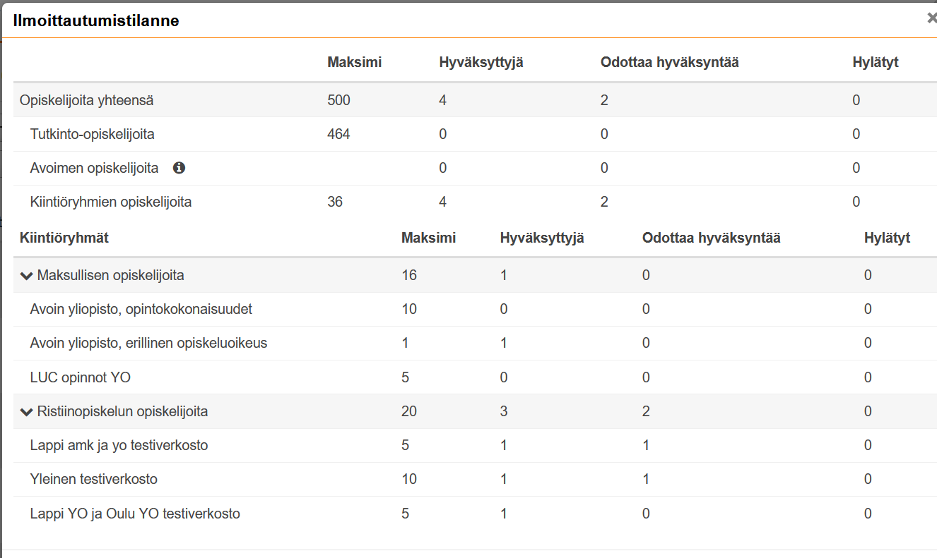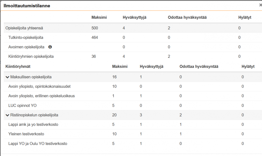 Ilmoittautumistilanne-painikkeesta pääset tarkastelemaan toteutuksen eri kiintiöryhmien (tutkinto, avoin, maksullinen koulutus, ristiinopiskelu) ilmoittautumistilanteen. Kun avaat ikkunan, modaali näyttää toteutukselle ilmoittautuneiden opiskelijoiden määrän ja tilan.