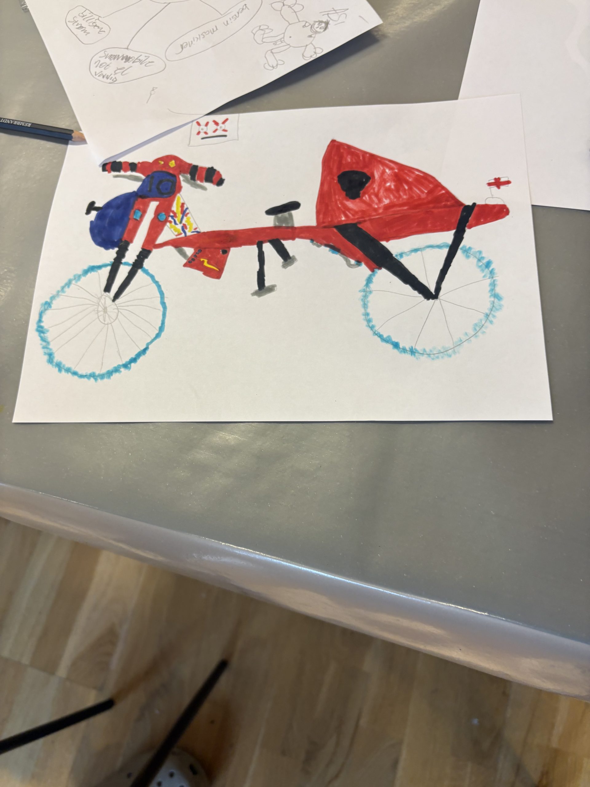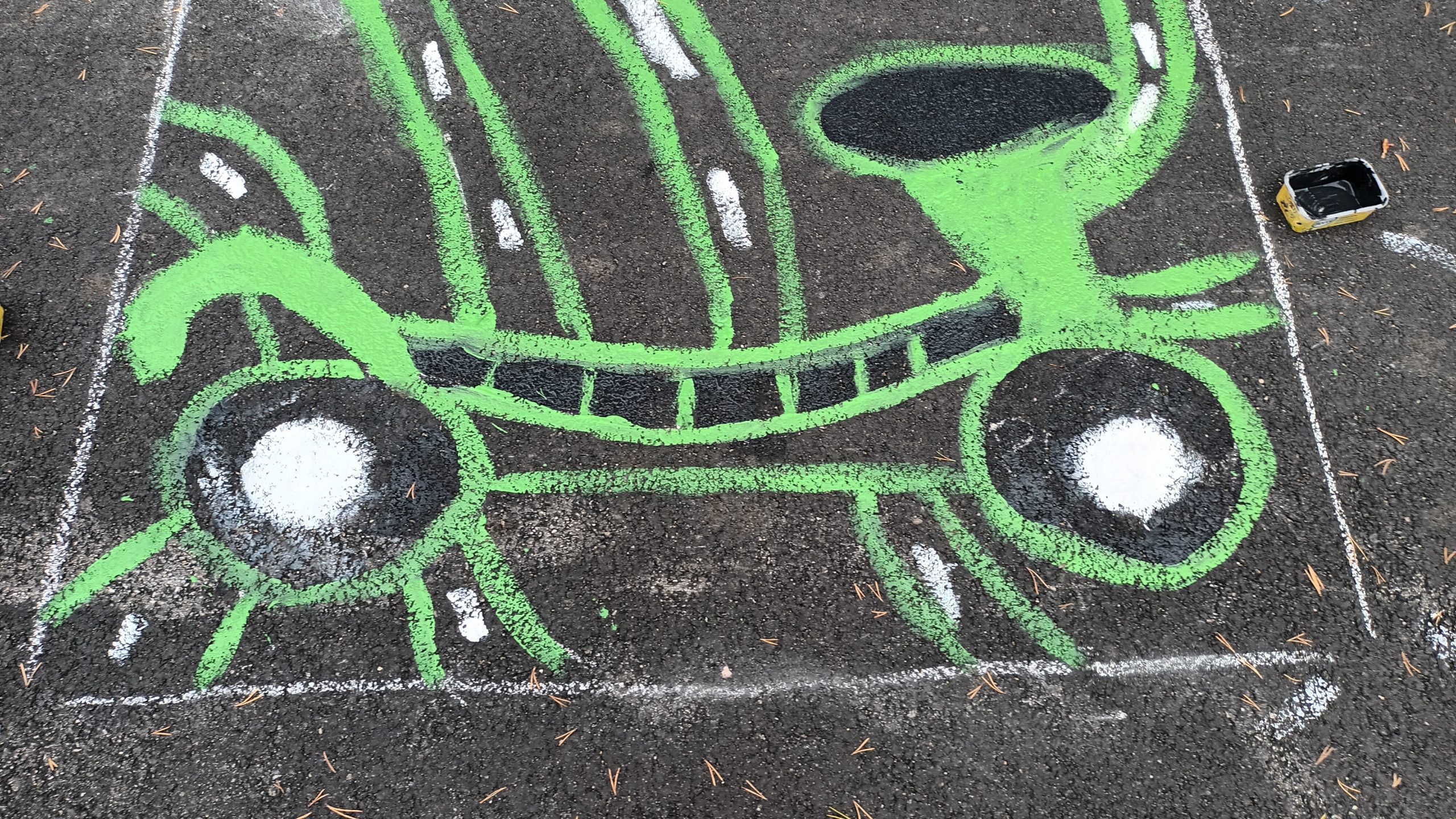 In the workshop we first drew what we were going to paint outside, and we painted on the walking path. We chose to paint a motorcycle because we like to drive it, and we chose a Kawasaki. We had fun in the workshops inside, but outside was not as fun. Drawing cross on paper went well, but it was more difficult to paint on the asphalt. The green motorbike looks good and is fast. I liked the green motorbike.